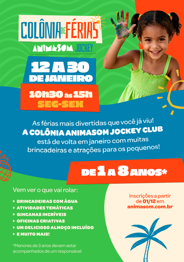 Colônia de Férias para todas as idades? É aqui no Jockey mesmo. Confira abaixo as duas opções para a temporada de Verão, divididas por faixa etária para crianças até 8 anos de idade com a Animasom e outro grupo para crianças a partir de 8 anos de idade com a Gecrear.