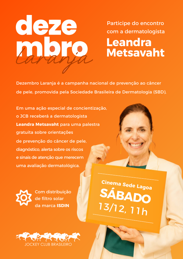 Em uma ação especial de concientização no mês do Dezembro Laranja, o Jockey Club Brasileiro receberá a dermatologista Leandra Metsavaht para uma palestra gratuita sobre orientações de prevenção do câncer de pele, diagnóstico, alerta sobre os riscos e sinais de atenção que merecem uma avaliação dermatológica.