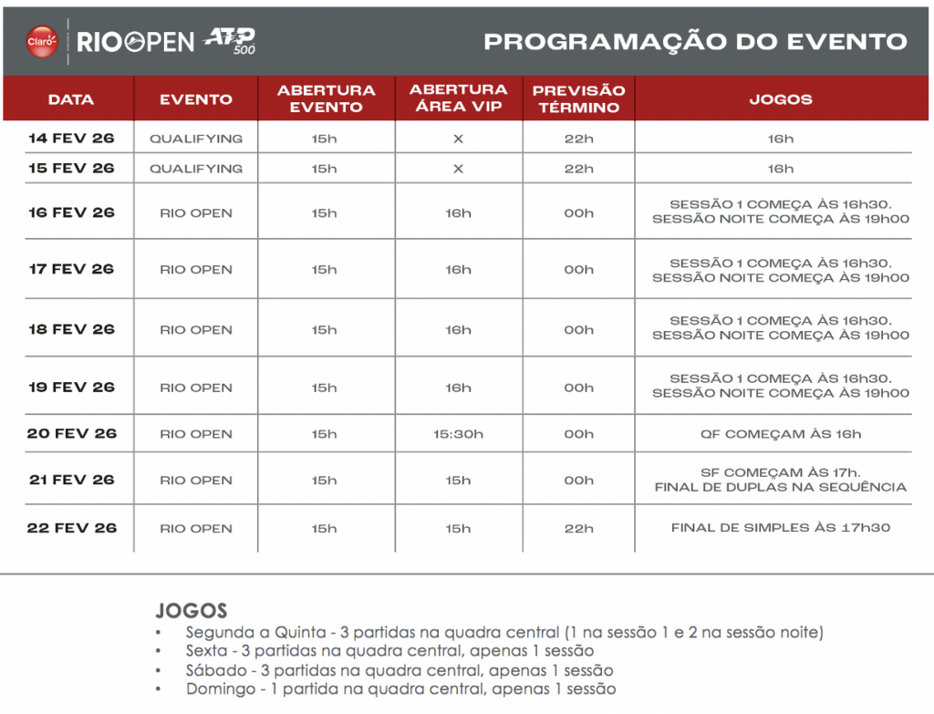 Em breve, serão divulgados os acessos ao clube durante o evento e quais quadras serão bloqueadas temporariamente. Acompanhe as notícias do Rio Open pelo site e Instagram oficiais do evento.
